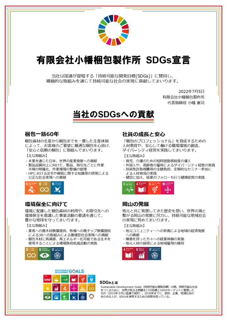 平成から令和に時代が変わり、私たちはグローバル化に向けた新たなニーズに着目し、梱包業者の枠組みを飛び出し、令和元年に神戸税関より保税蔵置場の許可を取得、令和4年に通関業の許可を頂きました。私たちはお育て頂いた企業様とのご縁を大切にしながら、これからも岡山の発展に貢献し、成長し続ける企業でありたいと考えております。