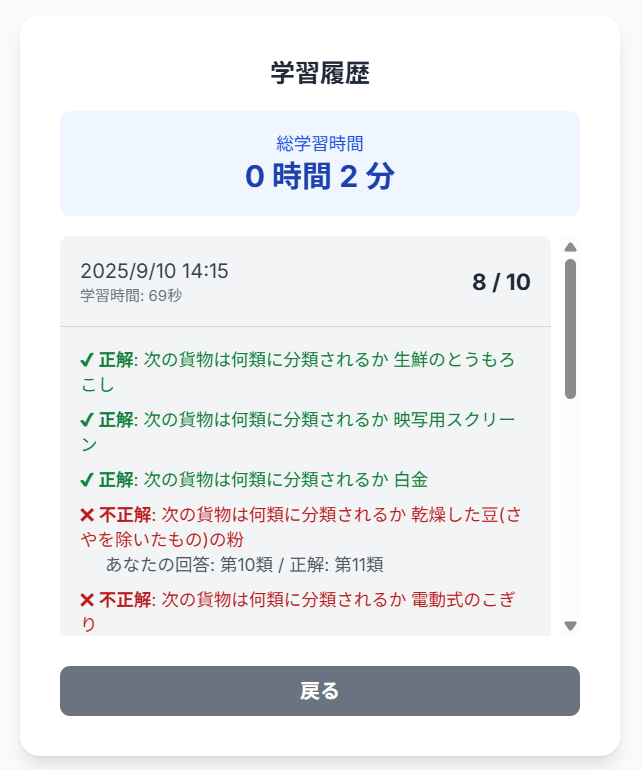 • 詳細な解答履歴:各テストで「どの問題をどう間違えたか」を一覧で確認。自分の弱点を客観的に分析できます。