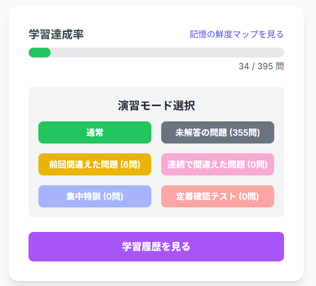 • 学習達成率:一度でも正解できた問題の割合をプログレスバーで表示。進捗がひと目でわかります。